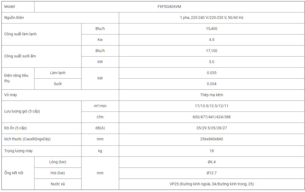 Dàn lạnh FXFSQ40AVM kết nối được với tất cả các model dàn nóng hệ 1 và 2 chiều VRV IV S, VRV H, VRV A. Tính năng nổi bật của sản phẩm là: Chức năng cảm biến với cảm biến kép; Điều khiển hướng gió độc lập; Chức năng chặn hướng gió; Bơm nước xả là phụ kiện tiêu chuẩn với mức nâng 850mm. FXFSQ40AVM thuộc hệ điều hòa trung tâm VRV.
