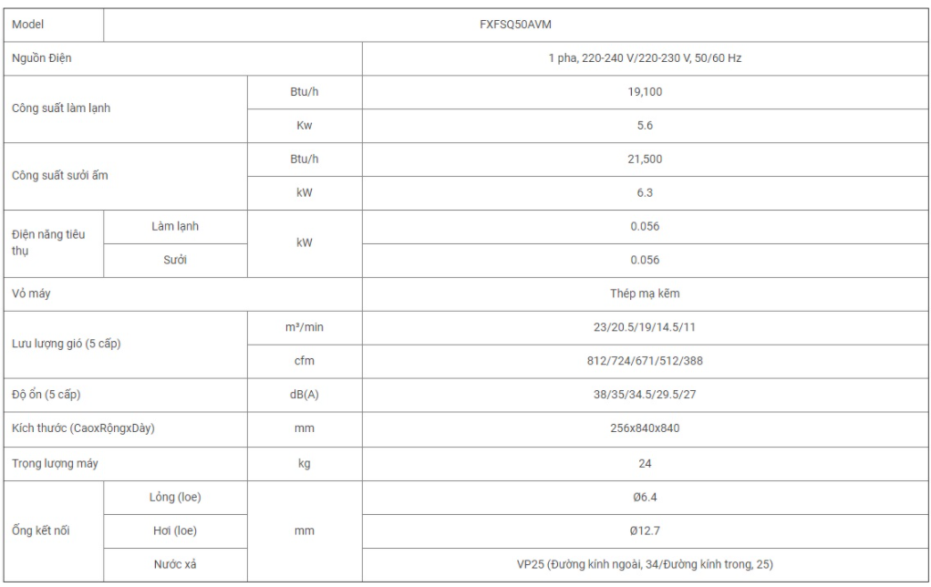 Dàn lạnh FXFSQ50AVM kết nối được với tất cả các model dàn nóng hệ 1 và 2 chiều VRV IV S, VRV H, VRV A. Tính năng nổi bật của sản phẩm là: Chức năng cảm biến với cảm biến kép; Điều khiển hướng gió độc lập; Chức năng chặn hướng gió; Bơm nước xả là phụ kiện tiêu chuẩn với mức nâng 850mm. FXFSQ50AVM thuộc hệ điều hòa trung tâm VRV.