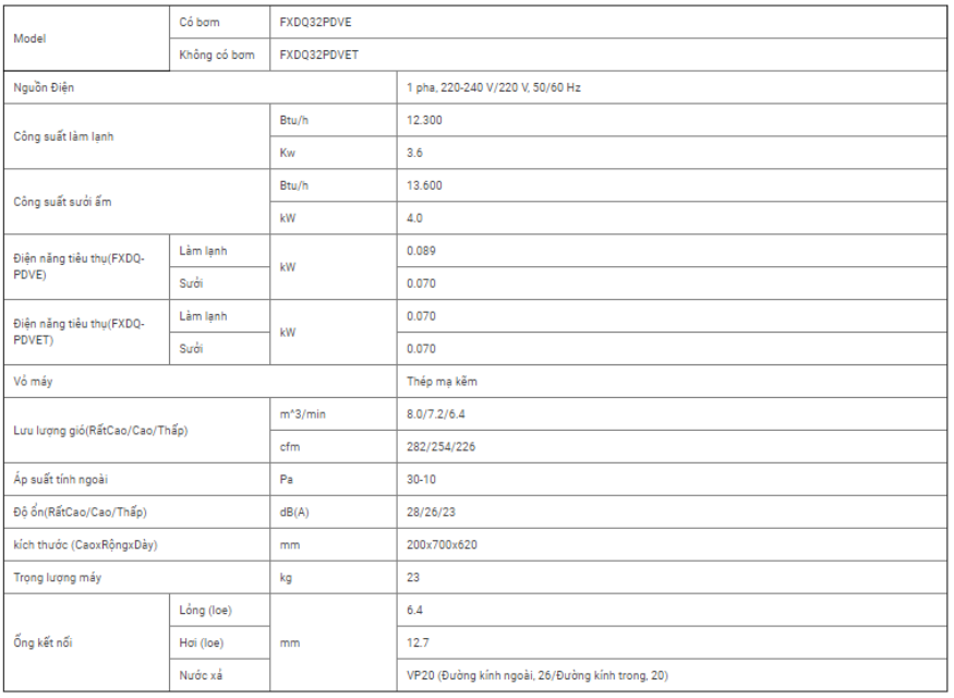 Dàn lạnh VRV Daikin FXDQ32PDVE là dàn lạnh giấu trần ống nối gió dạng mỏng 2 chiều loại tiêu chuẩn với công suất làm lạnh 12.300 BTU, công suất nóng 13.600 BTU. Máy mỏng (chỉ cao 200 mm) thích hợp lắp đặt cho các không gian trần hẹp khoảng 240 mm.
