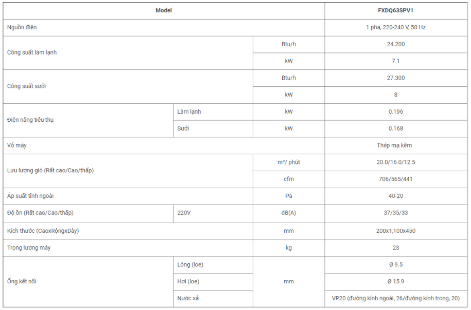 Dàn lạnh VRV Daikin giấu trần nối ống gió dạng mỏng 2 chiều FXDQ63SPV1 với công suất lạnh 24.200 BTU, công suất sưởi 27.300 BTU. Sử dụng gas R410a thân thiện với môi trường, không hủy hoại tầng ozon. Máy thiết kế mỏng, nhỏ gọn với chiều cao chỉ 200mm, kiểu dàn lạnh này thích hợp cho việc lắp đặt ở những không gian trần có khoảng cách nhỏ khoảng 240mm giữa trần giật cấp và vách trần trong phòng. Chiều ngang của dàn lạnh chỉ 450mm rất phù hợp lắp đặt những không gian trên trần bị giới hạn.