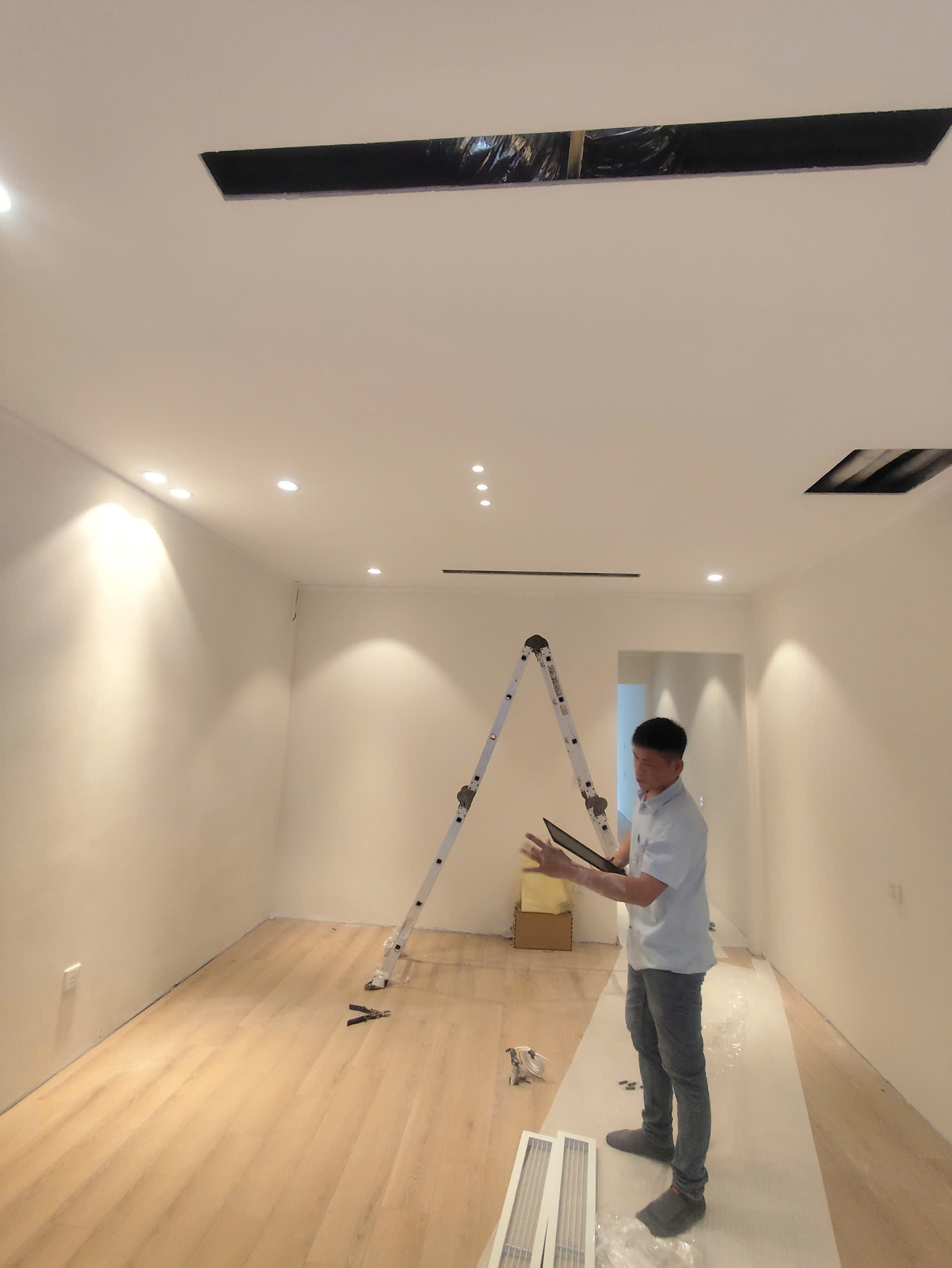 Đội ngũ kỹ thuật vừa hoàn thiện lắp đặt hệ thống điều hòa âm trần nối ống gió Daikin cho căn liền kề tại khu đô thị Vinhomes Ocean Park. Đây là giải pháp điều hòa cao cấp, mang lại sự tiện nghi và thẩm mỹ tuyệt đối cho không gian sống hiện đại.